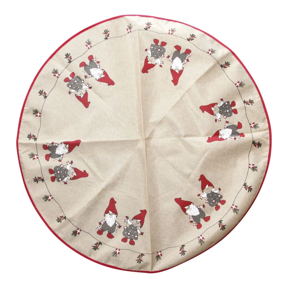 Dette juletræstæppe er rundt og har en diameter på 1 meter. Langs kanten er juletræstæppet udsmykket med nogle fine julenisser i røde og grå julefarver. Tæppets grundfarve er natur, hvilket står rigtig flot til det grønne juletræ.